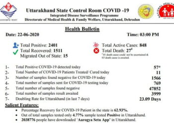 Read moreदेहरादून। राज्य में 57 और कोरोना पाजिटिव चिन्हित किए गए हैं। दोपहर तीन बजे के हेल्थ बुलेटिन के अनुसार राज्य...