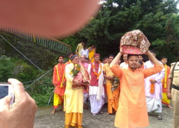 फोटो- वेद मंत्रोच्चार के साथ कथा मंडप पर जाते हुए कथावाचक आचार्य ममगाॅई। प्रकाश कपरूवाण जोशीमठ। भव्य कलश यात्रा के...