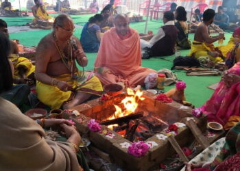 फोटो--नृसिंह महायज्ञ के मुख्य पुरोहित आचार्य सत्यनारायण मुख्य यज्ञ कुंड मे आहुतियाॅ देते हुए,साथ मे महामण्डलेश्वर अभिषेक चैतन्य गिरी महाराज...