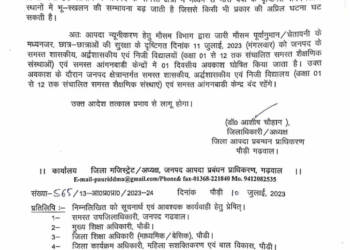 Read moreकमल बिष्ट/पौड़ी। जनपद में लगातार हो रही बारिश के चलते जिलाधिकारी ने स्कूली बच्चों की सुरक्षा के लिए कल (मंगलवार)...