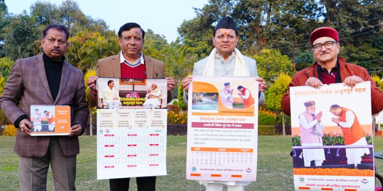 मुख्यमंत्री श्री पुष्कर सिंह धामी ने मुख्यमंत्री आवास में सूचना विभाग, उत्तराखंड सरकार द्वारा प्रकाशित नववर्ष 2026 के आधिकारिक कैलेंडर का विधिवत विमोचन किया। इस अवसर पर मुख्यमंत्री ने कैलेंडर के आकर्षक स्वरूप, उत्कृष्ट मुद्रण गुणवत्ता एवं विषयवस्तु की सराहना करते हुए कहा कि यह कैलेंडर राज्य सरकार की योजनाओं, उपलब्धियों तथा जनकल्याणकारी नीतियों के साथ-साथ सरकार द्वारा लिए गए ऐतिहासिक एवं दूरदर्शी निर्णयों को प्रभावी ढंग से जनमानस तक पहुँचाने का सशक्त माध्यम है।