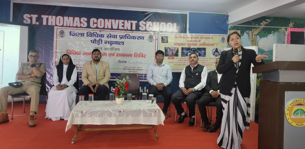 पौड़ी गढ़वाल। जिला विधिक सेवा प्राधिकरण के तत्वावधान में सोमवार को सेंट थॉमस कान्वेंट स्कूल पौड़ी गढ़वाल में विधिक जागरुकता एवं साक्षरता शिविर का आयोजन किया गया। शिविर में नालसा थीम एक मुट्ठी आसमान, लोकपाल लघु फिल्म, नशा विरोधी लघु फिल्म, डाउन अभियान के अंतर्गत “तुम गिरना मत” तथा मादक द्रव्यों के दुरुपयोग से मुक्त भारत के लिए जागरूकता और स्वास्थ्य मार्गदर्शन जैसी लघु फिल्मों का प्रदर्शन किया गया।