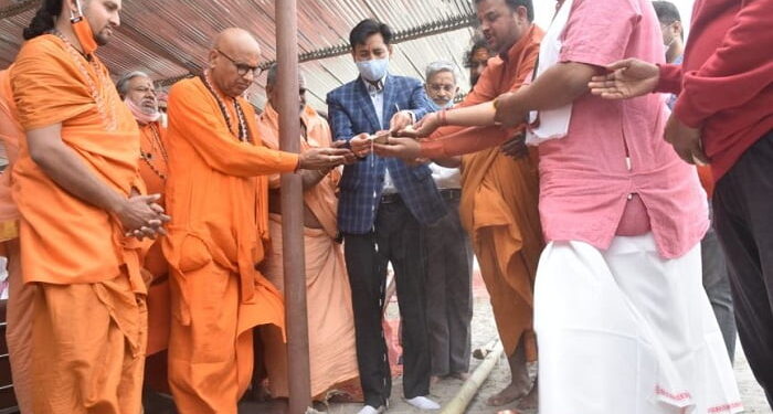 हरिद्वार। नीलधारा स्थित चंडीटापू में मंगलवार को पुरी पीठाधीश्वर शंकराचार्य स्वामी निश्चलानंद सरस्वती जी महाराज की छावनी में उनके प्रतिनिधि प्रफुल्ल चैतन्य ब्रह्मचारी और मेलाधिकारी दीपक रावत ने विधि.विधान से भूमि पूजन, कलश पूजन, धर्मध्वजा पूजन कर वैदिक मंत्रोच्चार के साथ धर्म ध्वजा स्थापित की।