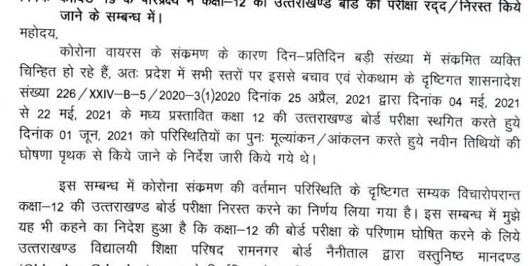 कोरोना संकट के चलते उत्तराखंड सरकार ने कक्षा 12 के लिए उत्तराखंड बोर्ड एग्जाम 2021 को रद्द कर दिया है। राज्य सरकार की ओर से इस बाबत आदेश जारी कर दिया गया है। इससे पहले राज्य बोर्ड 10वीं की परीक्षा भी रद्द कर चुका है।