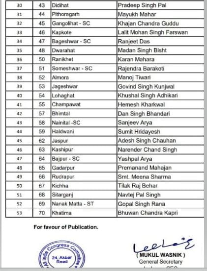 कांग्रेस चुनाव अभियान समिति के अध्यक्ष हरीश रावत पहले ही कह चुके थे कि भाजपा तथा अन्य दलों की सूची के बाद कांग्रेस अपनी सूची जारी करेगी। उसके बाद भी कांग्रेस को वक्त लग गया। कांग्रेस की इस सूची में कुछ हटकर, कुछ नया नहीं है। अधिकांश सीटों पर उन सभी को टिकट दिया गया है, जो कांग्रेस के लिए चुनाव लड़ते हैं। हालांकि वे पिछली बार चुनाव हार गए हों। कांग्रेस ने अपने सभी विधायकों को टिकट दिया है।