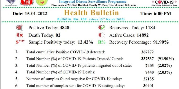देहरादून। राज्य में कोरोना संक्रमण एक कदम और तेज हुआ है। आज 3848 लोग संक्रमित हुए हैं। दो लोगों की संक्रमण से मौत हुई है। 1184 लोग संक्रमण से मुक्त हुए हैं। राज्य में एक्टिव कोरोना संक्रमितों की संख्या तेजी से बढ़ी है, जो अब 14892 हुई है।