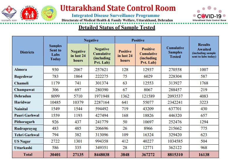 हेल्थ बुलेटिन के अनुसार देहरादून में आज 1362, नैनीताल में 719, हरिद्वार में 641, उधमसिंह नगर में 412, पौड़ी गढ़वाल 168, अल्मोड़ा में 128, टिहरी गढ़वाल में 109 संक्रमित हुए हैं। अन्य जिलों में भी तेजी से संक्रमण बढ़ने लगा है।