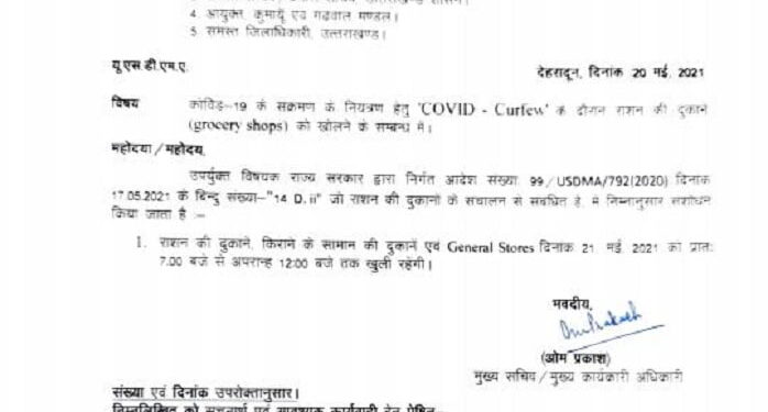 मुख्य सचिव ओम प्रकाश द्वारा जारी किए गए आदेश में कहा गया है कि 17 मई को कोरोना कर्फ्यू को लेकर जारी किए गए निर्देशों में संशोधन करते हुए यह तय किया गया है कि राशन की दुकानें, किराने के सामान से संबंधित दुकानें और जनरल स्टोर 21 मई से प्रातः 7 बजे से अपरान्ह 12 बजे तक खुली रहेंगी।