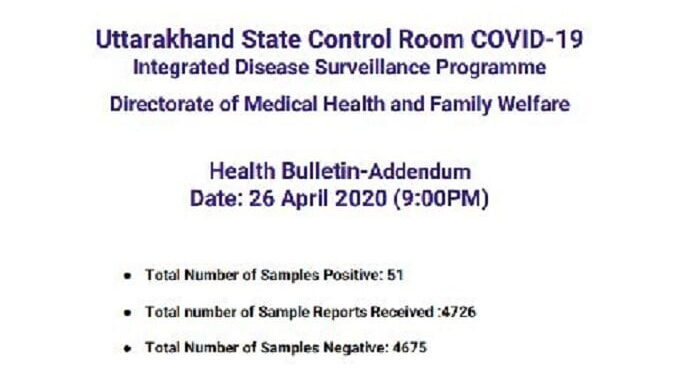 राज्य नियंत्रण कक्ष कोविड-19 के अनुसार रोज सायं 6 बजे स्वास्थ्य बुलेटिन जारी होता है। लेकिन स्वास्थ्य बुलेटिन जारी होने के बाद प्राप्त सूचना के अनुसार कोविड-19 का एक और संक्रमित व्यक्ति की जानकारी मिली है। दून मेडिकल कालेज लैब से इस संबंध में सूचना प्राप्त हुई है।