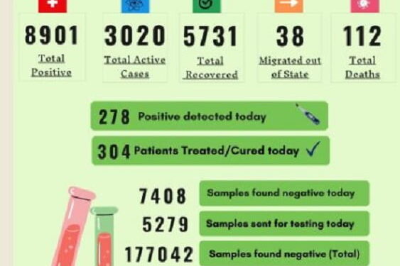 रात्रि 8 बजे जारी किए गए हेल्थ बुलेटिन के अनुसार राज्य में अब तक 112 लोग कोरोना से मर चुके हैं। राज्य में एक्टिव मामले 3020 हैं। अब तक 5731 लोग स्वस्थ होकर अपने घरों को जा चुके हैं। 9498 सैंपल जांच के इंतजार में हैं। अब सघन हो रही जांच के कारण इन सैंपल से काफी लोग पाजिटिव निकल रहे हैं।