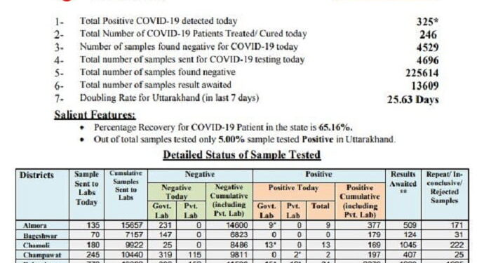 शाम साढ़े सात बजे जारी किए गए हेल्थ बुलेटिन के अनुसार राज्य में एक्टिव कोरोना मरीजों की संख्या 3997 पहुंच गई है। आज 325 लोग संक्रमित हुए तो 246 लोग विभिन्न अस्पतालों से ठीक होकर घरों को लौटे। 7748 लोग अब तक कोरोना संक्रमण से मुक्त हो चुके हैं। राज्य में सबसे खराब स्थिति हरिद्वार जिले की है, जहां 1200 से अधिक संक्रमित एक्टिव हैं। मैदानी चार जिले तो कोरोना के मामले अत्यधिक संवेदनशील बने हुए हैं, पहाड़ों की हालत भी दिन प्रतिदिन खराब होती जा रही है। पहाड़ों में भी कई जिले सौ से अधिक एक्टिव मरीज वाले हैं।