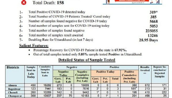 उत्तराखंड के लिए चिंता की बात यह है कि अब सैंपल लेने की दर बढ़ रही है और सैंपल में पाजिटिव भी अधिक निकल रहे हैं। इसलिए हर रोज तीन सौ से या फिर चार सौ से अधिक संक्रमित मिल रहे हैं।