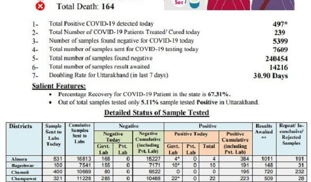 देहरादून। उत्तराखंड में एक बार फिर से कोरोना विस्फोट हुआ है। एक दिन में 497 संक्रमित चिन्हित हुए हैं। राज्य में संक्रमितों का आंकड़ा बढ़कर 12961 पहुंच गया है। कोरोना संक्रमण से आज एक दिन में छह लोगों की मौत हुई है। अब तक राज्य में 164 लोगों की मौत हो चुकी है। विभिन्न चिकित्सालयों से 239 लोग ठीक होकर अपने घरों को लौटे हैं।