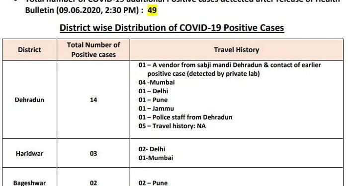 राज्य नियंत्रण कक्ष कोविड-19 द्वारा रात्रि 9 बजे जारी किए गए हेल्थ बुलेटिन के अनुसार देहरादून में 14 लोग संक्रमित हुए हैं। एक व्यक्ति सब्जी मंडी में कोरोना संक्रमितों के संपर्क में आने से संक्रमित हुआ है। चार लोग मुंबई से आए हैं। एक दिल्ली, एक पुणे, एक जम्मू, एक पुलिस कर्मी तथा पांच लोगों का यात्रा इतिहास ज्ञात नहीं है।