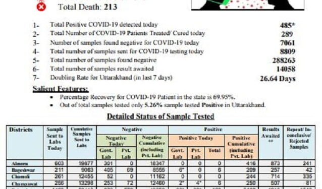 देहरादून। उत्तराखंड राज्य में कोरोना संक्रमण की दर लगातार बढ़ती जा रही है। आज फिर एक दिन में 485 लोग संक्रमित हुए हैं। राज्य में कोरोना संक्रमण का आंकड़ा 16000 के पार जाते हुए 16014 तक पहुंच गया है। आज कोरोना से छह लोगों की मौत हुई है।