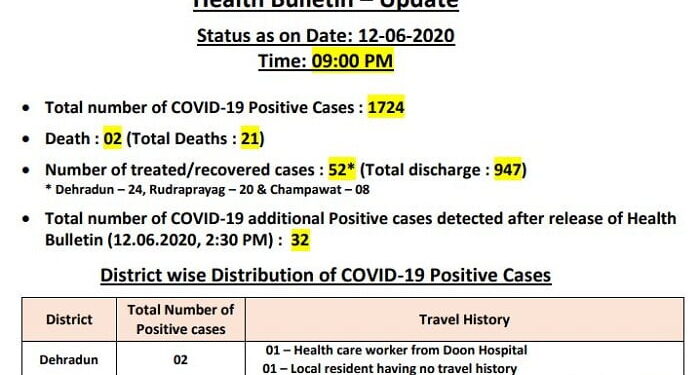 हेल्थ बुलेटिन के अनुसार देहरादून में दो लोग संक्रमित हुए हैं। एक दून मेडिकल कालेज में स्वास्थ्य कर्मी है, जबकि अन्य स्थानीय निवासी है, जिसका यात्रा इतिहास ज्ञात नहीं है। हरिद्वार में 24 लोग संक्रमित हुए हैं। जो दिल्ली, महाराष्ट, नेपाल, बरेली, बिहार से आए हैं। टिहरी में दो लोग संक्रमित हुए हैं, जो मुंबई से आए हैं। उधमसिंह नगर में चार लोग संक्रमित हुए हैं, दो दिल्ली से एक मुंबई से आया है, जबकि एक कोरोना संक्रमित की मौत हुई है।