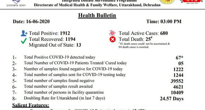 राज्य नियंत्रण कक्ष कोविड-19 द्वारा जारी हेल्थ बुलेटिन के अनुसार अल्मोड़ा में 10 लोग संक्रमित हुए हैं। एक मुंबई, तीन गुड़गांव, छह दिल्ली से लौटकर आए हैं। देहरादून में 12 लोग संक्रमित हुए हैं, जिसमें एक बुलंदशहर, दो दिल्ली, पांच स्थानीय निवासी, दो स्वास्थ्य कर्मी तथा दो पूर्व में संक्रमित लोगों के संपर्क में आने से संक्रमित हुए हैं। हरिद्वार में आठ लोग संक्रमित हुए हैं, चार मुंबई से आए हैं, एक बागपत, दो स्थानीय निवासी तथा एक पूर्व में संक्रमित व्यक्ति के संपर्क में आने संक्रमित हुए हैं।