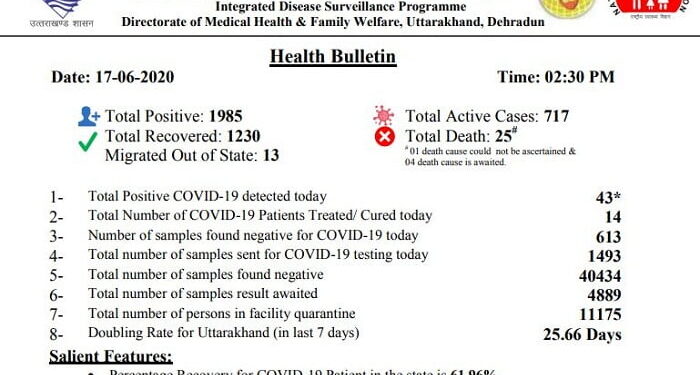 देहरादून। राज्य में कोरोना संक्रमण का क्रम जारी है। दोपहर ढाई बजे के हेल्थ बुलेटिन के अनुसार राज्य में आज 43 संक्रमण हुए हैं। राज्य में कोरोना संक्रमितों की संख्या दो हजार के करीब 1985 हो गई है।
