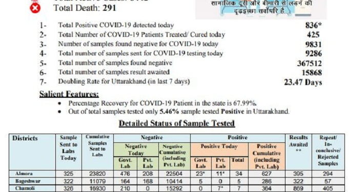 देहरादून। उत्तराखंड में एक दिन में सबसे अधिक कोरोना संक्रमितों का रिकार्ड आज बना। राज्य में एक दिन में 836 लोग संक्रमित मिले। राज्य का आंकड़ा 21234 पहुंच गया है। राज्य में कोरोना से ग्यारह लोगों की मौत हो गई, अब तक 291 लोग कोरोना की भेंट चढ़ चुके हैं।