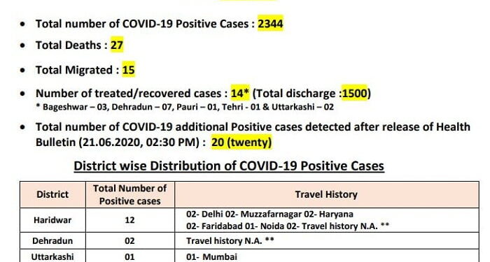 राज्य नियंत्रण कक्ष कोविड-19 से जारी रात्रि 9 बजे के हेल्थ बुलेटिन के अनुसार हरिद्वार में 12 लोग संक्रमित हुए हैं। जिसमें दो दिल्ली, दो मुज्जफरनगर, दो हरियाणा, दो फरीदाबाद, एक नोएडा से आए हैं, जबकि दो लोगों का यात्रा इतिहास ज्ञात नहीं है। देहरादून में दो लोग संक्रमित हुए हैं, दोनों का यात्रा इतिहास ज्ञात नहीं है।