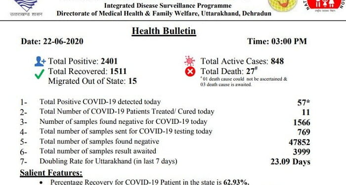 देहरादून। राज्य में 57 और कोरोना पाजिटिव चिन्हित किए गए हैं। दोपहर तीन बजे के हेल्थ बुलेटिन के अनुसार राज्य में अब कोरोना पाजिटिव का आंकड़ा 2401 पहुंच गया है।
