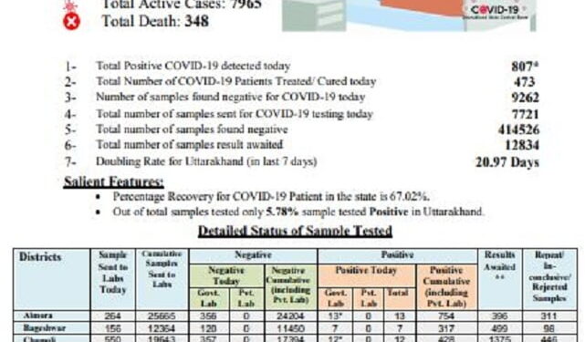 शाम साढ़े सात बजे जारी किए गए हेल्थ बुलेटिन के अनुसार राज्य के विभिन्न कोरोना अस्पतालो ंसे 473 लोग स्वस्थ होकर अपने घरों को लौटे। राज्य में एक्टिव कोरोना मरीजों की संख्या 7965 पहुंच गई है। अब तक 17046 लोग स्वस्थ होकर अपने घरों को लौट चुके हैं। 12834 सैंपल विभिन्न लैब में जांच का इंतजार कर रहे हैं। राज्य में रिकवरी रेट और थोड़ा नीचे आया है, अब यह 67.02 प्रतिशत है, जबकि नेशनल स्तर पर रिकवरी रेट 77 प्रतिशत से अधिक है। उत्तराखंड में कोरोना संक्रमण अनियंत्रित होता जा रहा है। यह पर्वतीय राज्य के लिए चिंता का विषय है।