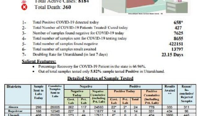 देहरादून। राज्य में आज एक बार फिर से 658 लोग कोरोना संक्रमित हुए। राज्य में कोरोना संक्रमितों का आंकड़ा 26094 पहुंच गया है। आज बारह लोग कोरोना संक्रमण से मरे। राज्य में अब तक 360 लोग कोरोना से मौत के मुंह में जा चुके हैं।