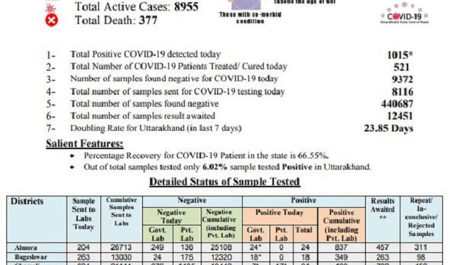 शाम सात बजे जारी किए गए हेल्थ बुलेटिन के अनुसार आज राज्य के विभिन्न अस्प्तालों से 521 लोग स्वस्थ होकर अपने घरों को लौटे। अब तक 18783 लोग कोरोना की जंग जीत चुके हैं। अब राज्य में एक्टिव कोरोना संक्रमितों की संख्या 8955 हो गई है। 111 कोरोना संक्रमित उत्तराखंड से दूसरे राज्यों को विस्थापित किए जा चुके हैं। अब तक विभिन्न लैब में 12451 सैंपल जांच रिपोर्ट आने का इंतजार कर रहे हैं। राज्य में रिकवरी रेट और गिरकर 66.55 प्रतिशत तक रह गई हैं।