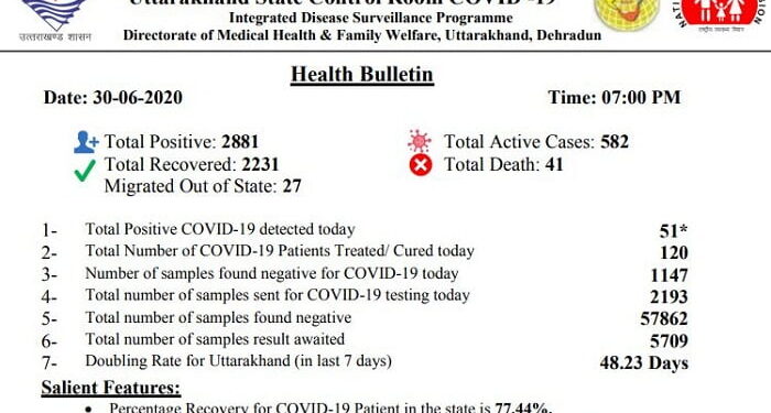 राज्य नियंत्रण कक्ष कोविड-19 द्वारा शाम 7 बजे जारी किए गए हेल्थ बुलेटिन के अनुसार आज 51 कोरोना संक्रमितों की पहचान की गई। राज्य में अब कोरोना संक्रमितों का आंकड़ा 2881 पहुंच गया है। राज्य में अब तक कोरोना संक्रमण से 41 लोगों की मौत हो चुकी है, महंत इंदिरेश अस्पताल में दो संक्रमितों की आज मौत हो गई। एक 22 वर्षीय युवती और 63 वर्षीय व्यक्ति की मौत हुई है। राज्य में विभिन्न जिलों के अस्पतालों से 120 निरोग होकर घर चले गए। राज्य में इस समय 2231 संक्रमित निरोग होकर घर जा चुके हैं, एक्टिव संक्रमितों की संख्या 582 रह गई है।