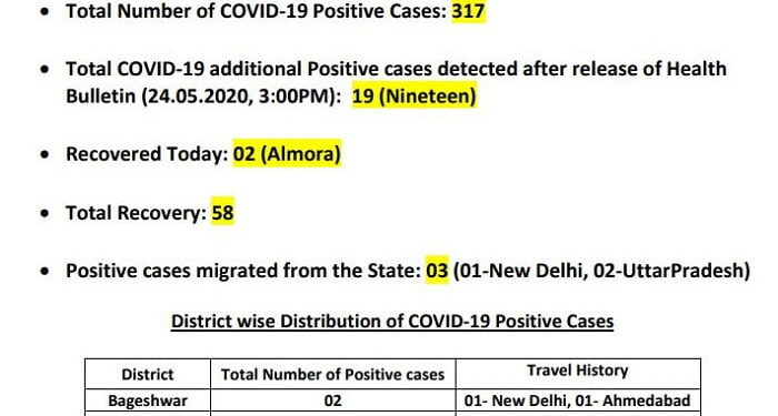 राज्य नियंत्रण कक्ष कोविड-19 द्वारा शाम साढ़े सात बजे जारी हेल्थ बुलेटिन में कहा गया है कि 19 और कोरोना पाजिटिव चिन्हित किए गए हैं। बागेश्वर जिले में दो रिपोर्ट पाजिटिव आए हैं, जिनमें एक दिल्ली तथा दूसरा अहमदाबाद से आया है। चमोली जिले में पांच की रिपोर्ट पाजिटिव आई है। एक व्यक्ति कोरोना पीड़ित के संपर्क में आया था, जबकि एक ही परिवार के चार लोग दिल्ली से आए हैं। देहरादून में 4 संक्रमित चिन्हित किए गए है। एक व्यक्ति कोरोना पीड़ित परिजन के साथ संक्रमित हुआ है, जबकि तीन मुंबई से लौटे हैं। उधमसिंह नगर में आठ संक्रमित चिन्हित किए गए हैं, सभी मुंबई से लौटे हैं।