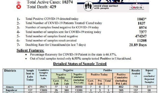 शाम साढ़े सात बजे जारी किए गए हेल्थ बुलेटिन के अनुसार विभिन्न अस्पतालों से 1037 लोग स्वस्थ होकर अपने घरों को लौटे। अब तक 22077 लोग कोरोना संक्रमण से विजय प्राप्त कर चुके हैं, जबकि इस समय राज्य में 10374 एक्टिव कोरोना संक्रमित हैं। राज्य में अब रिकवरी प्रतिशत 66.87 प्रतिशत है। विभिन्न लैब 11208 सैंपल जांच रिपोर्ट आने का इंतजार कर रहे हैं।