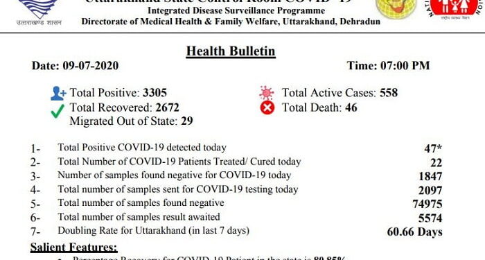 राज्य नियंत्रण कक्ष कोविड-19 द्वारा शाम 7 बजे जारी किए गए हेल्थ बुलेटिन के अनुसार राज्य में एक्टिव कोरोना संक्रमितों की संख्या 558 है। सिर्फ रुद्रप्रयाग जनपद ऐसा है,जहां कोई भी एक्टिव कोरोना संक्रमित नहीं है। टिहरी जिला एक इस मामले में शून्य हुआ था, लेकिन अब वहां भी 6 एक्टिव संक्रमित मौजूद हैं।