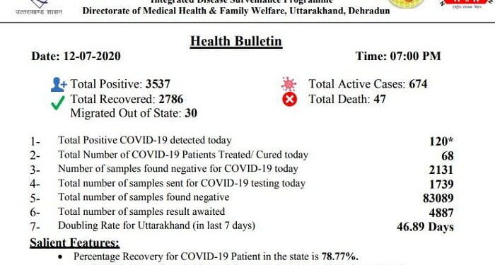 राज्य के विभिन्न अस्पतालों से 68 मरीज ठीक होकर अपने घरों को गए हैं। सुशीला तिवारी चिकित्सालय हल्द्वानी एक 54 वर्षीय मरीज की कोरोन संक्रमण से मौत हुई है। इस तरह कोरोना संक्रमण से मौतों का आंकड़ा 47 पहुंच गया है।