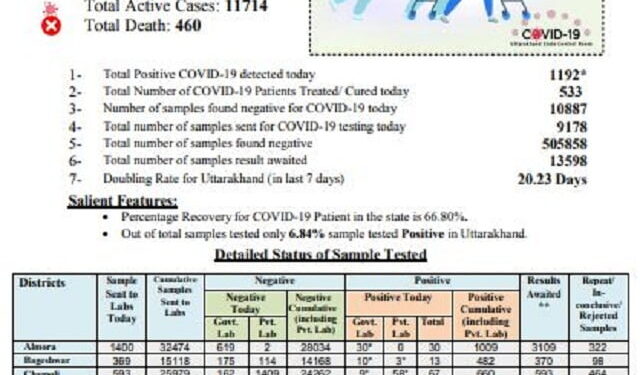 देहरादून। राज्य में एक बार फिर एक दिन में हजार से अधिक संक्रमित मिले हैं। आज 1192 संक्रमित चिन्हित किए गए हैं। इसके चलते राज्य में संक्रमण का आंकड़ा बढ़कर 37139 तक पहुंच गया है। आज 13 लोगों ने कोरोना संक्रमण की वजह से दम तोड़ा। राज्य में अब तक कोरोना ने 460 लोगों की जान ले ली है।