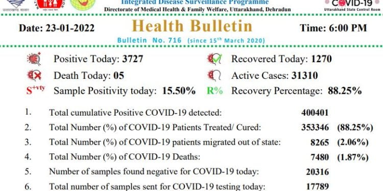 देहरादून। उत्तराखंड में रोज पांच हजार के करीब पहुंच चुका संक्रमण आज चार हजार से नीचे आया है। आज 3727 संक्रमित हुए हैं। पांच लोगों की संक्रमण से मौत हुई है। 1270 लोग संक्रमणसे मुक्त हुए हैं। राज्य में एक्टिव मरीजों की संख्या 31310 पहुंच गई है।