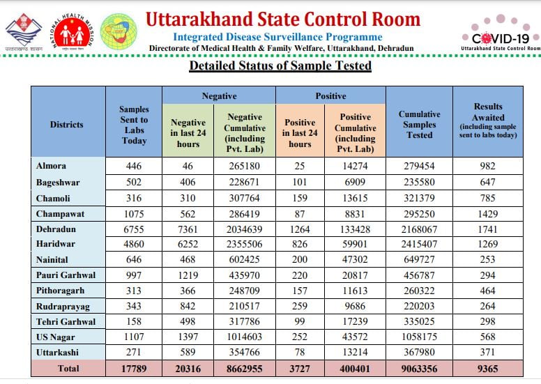कोरोना नियंत्रण कक्ष से जारी किए गए हेल्थ बुलेटिन के अनुसार देहरादून में 1264 संक्रमित हुए हैं। हरिद्वार में 826, उधमसिंह नगर में 252 लोग संक्रमित हुए हैं।