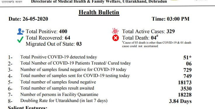 उत्तराखंड कोरोना संक्रमण के मामले में तेजी से आगे बढ़ रहा है। अपरान्ह 3 बजे जारी हेल्थ बुलेटिन के अनुसार उत्तराखंड में आज 51 संक्रमित चिन्हित किए गए। इस तरह कुल संक्रमितों की संख्या 400 हो गई है।