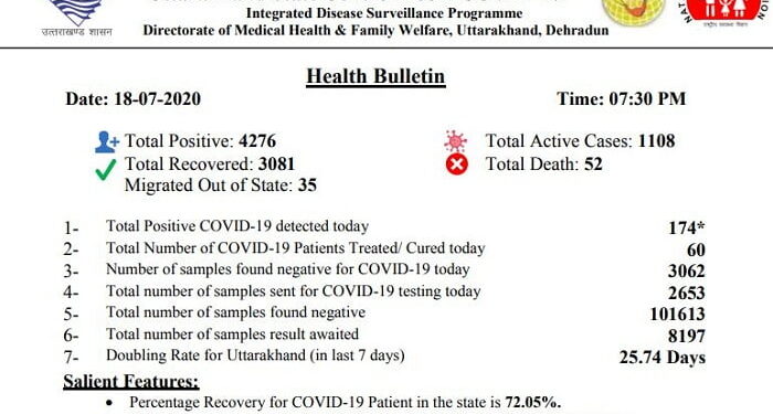 राज्य नियंत्रण कक्ष कोविड-19 द्वारा शाम साढ़े सात बजे जारी किए गए हेल्थ बुलेटिन के अनुसार राज्य में आज 174 संक्रमित चिन्हित हुए हैं। तेजी से बढ़ रहे संक्रमण की वजह से राज्य में संक्रमितों की संख्या 4276 पहुंच गई है। राज्य के विभिन्न अस्पतालों से 60 कोरोना संक्रमित ठीक होकर घरों को लौटे। राज्य में एक्टिव संक्रमितों की संख्या भी तेजी से बढ़ रही है, अब एक्टिव संक्रमित 1108 हो गए हैं। हालांकि 3081 लोग ठीक होकर घरों को जा चुके हैं। ऋषिकेश एम्स में एक 52 वर्षीय पुरुष की संक्रमण से मौत हुई है।