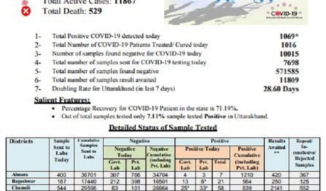 देहरादून। राज्य में कोरोना संक्रमण का स्तर एक बार फिर तेज हो गया है। एक दिन में एक हजार से अधिक 1069 संक्रमित चिन्हित किए गए, कोरोना संक्रमण का आंकड़ा बढ़कर 43720 पहुंच गया है। आज राज्य के विभिन्न अस्पतालों में 17 लोगों की कोरोना से मौत हुई। अब तक राज्य में 529 लोग कोरोना की भेंट चढ़ गए हैं।