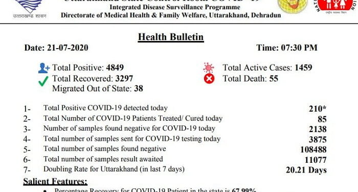 राज्य नियंत्रण कक्ष कोविड-19 द्वारा शाम साढ़े सात बजे जारी किए गए हेल्थ बुलेटिन के अनुसार राज्य में अभी ग्यारह हजार से अधिक सैंपल के नतीजों का इंतजार किया जा रहा है। मैदानी जिलों में संक्रमण का दायर तेजी से बढ़ रहा है, जबकि पर्वतीय जिलों में अभी बागेश्वर और रुद्रप्रयाग दो जिले ऐसे हैं, जहां एक्टिव संक्रमित शून्य हैं।