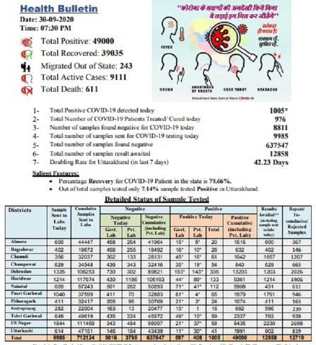 शाम साढ़े सात बजे जारी किए गए हेल्थ बुलेटिन के अनुसार विभिन्न अस्पतालों से 976 लोग स्वस्थ होकर अपने घरों को गए। पिछले दो दिनों में संक्रमितों से अधिक संख्या ठीक होने वालों की थी, आज वह क्रम भी उल्टा हुआ है। आज अधिक लोग संक्रमित हुए हैं, जबकि ठीक होने वालों की संख्या कम है। राज्य में अब तक 39035 लोग कोरोना की जंग जीत चुके हैं। राज्य में एक्टिव कोरोना संक्रमितों की संख्या 9111 है। राज्य में आज बीस लोगों की मौत कोरोना से हुई अब तक 611 लोग कोरोना की भेंट चढ़ गए हैं। 12858 सैंपल विभिन्न लैब में रिपोर्ट आने का इंतजार कर रहे हैं। राज्य का रिकवरी रेट भी अभी स्थिर है, जो 79.66 के स्तर पर है।