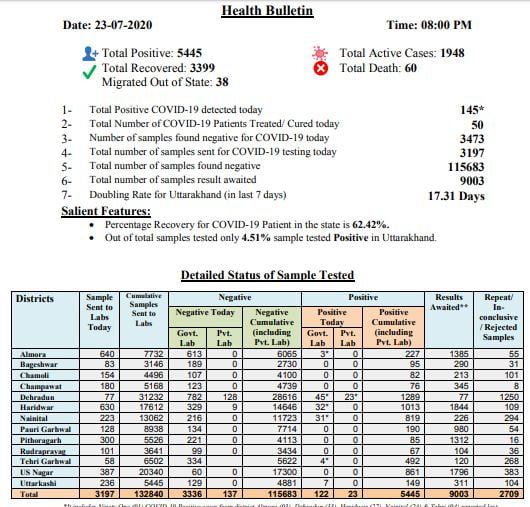 रात्रि आठ बजे जारी किए गए हेल्थ बुलेटिन के अनुसार राज्य में अब तक कोरोना से 60 मौतें हो चुकी हैं। 3399 लोग विभिन्न अस्पतालों से स्वस्थ होकर घरों को लौट चुके हैं। राज्य में एक्टिव मरीजों की संख्या तेजी से बढ़ते हुए 1948 पहुंच गई है। राज्य के लिए कोरोना संकट की सबसे बड़ी बात यह है कि अब ज्यादातर संक्रमित ऐसे हैं, जिनका कोई यात्रा इतिहास ही नहीं है। इससे संक्रमण की जड़ तक पहुंचने में दिक्कत हो रही है।