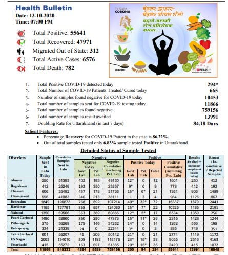 शाम सात बजे जारी किए गए हेल्थ बुलेटिन के अनुसार अब तक 782 लोग कोरोना संक्रमण की भेंट चढ़ चुके हैं। आज राज्य के विभिन्न अस्पतालों से 665 लोग स्वस्थ होकर अपने घरों को लौटे। अब तक 47971 लोग कोरोना की जंग जीत चुके हैं। राज्य में एक्टिव कोरोना संक्रमितों की संख्या 6576 है। 312 संक्रमित दूसरे राज्यों को स्थानांतरित हो चुके हैं। 13991 सैंपल विभिन्न लैब में जांच रिपोर्ट आने का इंतजार कर रहे हैं। राज्य ने रिकवरी रेट में छलांग लगाई है, यह बढ़कर 86.22 प्रतिशत पहुंची है।