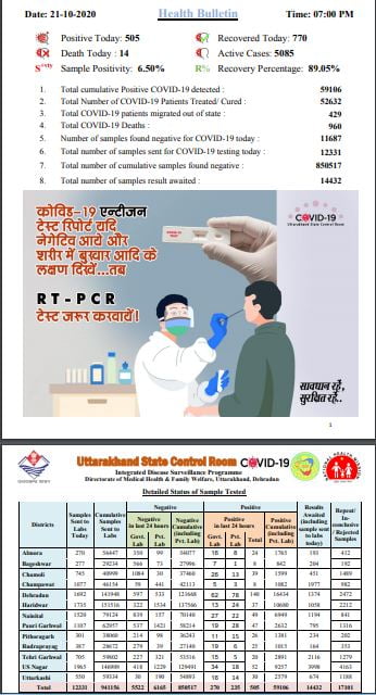 देहरादून। राज्य में कोरोना संक्रमण में उतार-चढ़ाव का दौर जारी है। आज 505 कोरोना संक्रमित चिन्हित किए गए। राज्य में संक्रमण का आंकड़ा 59106 पहुंच गया है। आज कोरोना से चैदह लोगों की मौत हो गई। अब तक 960 लोग कोरोना संक्रमण से अपनी जान गवां चुके हैं।