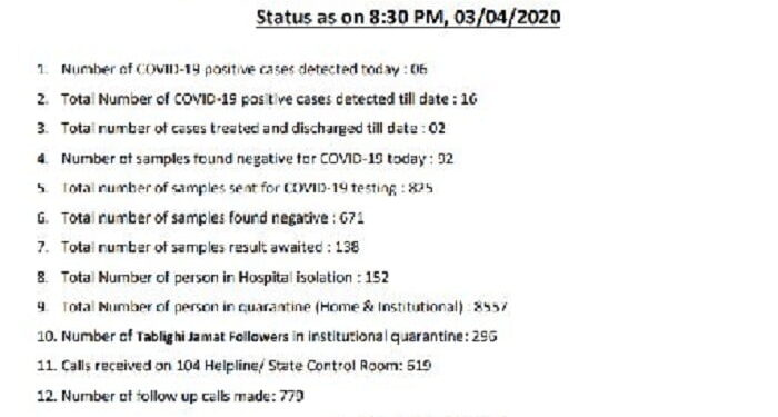 स्वास्थ्य विभाग द्वारा जारी हेल्थ बुलेटिन के अनुसार राज्य में अभी तक 825 सेंपल जांच के लिए भेजे गए थे। 687 के नतीजे अब तक आए हैं। जिनमें से 671 निगेटिव पाए गए। 16 पाजिटिव पाए गए हैं। अभी तक 138 के नतीजों की अभी प्रतीक्षा की जा रही है। दो दिनों में नौ मामलों के सामने आने की मूल वजह तबलीगी जमातियों को माना जा रहा है।
