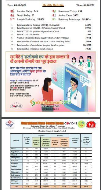 यदि आज जिलेवार कोरोना संक्रमितों की सूची देखें तो सभी जिलों का संक्रमण स्तर गिरता हुआ दिखाई देता है, सिर्फ देहरादून जिले में आज भी 97 संक्रमित सामने आए हैं।