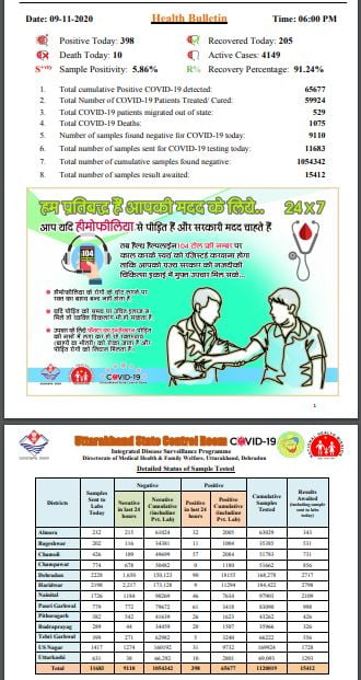 देहरादून। राज्य में आज 398 लोग कोरोना संक्रमण के दायरे में आए। इस तरह राज्य में संक्रमितों का आंकड़ा 65677 पहुंच गया है। कोरोना संक्रमण से आज दस लोगों न दम तोड़ा, अब तक 1075 लोग कोराना की वजह से अपनी जान गंवा चुके हैं।