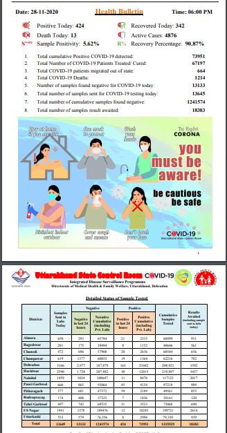 शाम छह बजे जारी किए गए हेल्थ बुलेटिन के अनुसार विभिन्न अपस्तालों से 342 लोग स्वस्थ होकर अपने घरों को लौटे। अब तक 67197 लोग कोरोना की जंग जीत चुके हैं और स्वस्थ होकर अपने घरों को जा चुके हैं। राज्य में अब एक्टिव कोरोना मरीजों की संख्या 4876 पहुंच गई है। राज्य का रिकवरी रेट भी लगातार गिरता जा रहा है, जो अब 90.87 प्रतिशत तक पहुंच गया है। यह नेशनल रिकवरी रेट के मुकाबले काफी नीचे है। 18383 सैंपल विभिन्न लैब में जांच रिपोर्ट आने का इंतजार कर रहे हैं।