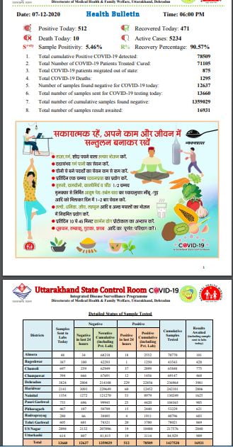 देहरादून। राज्य में कोरोना संक्रमण का स्तर बढ़ता जा रहा है। आज 512 संक्रमित चिन्हित किए गए। राज्य में संक्रमण का आंकड़ा 78509 पहुंच गया है। राज्य में आज कोरोना संक्रमण से दस लोगों की मौत हुई, जबकि अब तक 1295 लोग कोरोना की भेंट चढ़ चुके हैं।