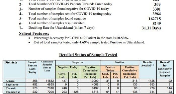 रात्रि आठ बजे जारी किए गए हेल्थ बुलेटिन के अनुसार 309 संक्रमित विभिन्न अस्पतालों से ठीक होकर घरों को लौटे हैं। बुलेटिन के अनुसार तीन लोगों को मौत सुशीला तिवारी मेडिकल कालेज हल्द्वानी में, एक की जौली ग्रांट अस्पताल में जबकि एक अन्य की दून मेडिकल कालेज में मौत हुई है। राज्य में इस समय एक्टिव पाजिटिव मामले 3028 हैं, जबकि 4847 लोग स्वस्थ होकर घरों को जा चुके हैं। 8149 सैंपल अभी जांच पूरी होने का इंतजार कर रहे हैं। लगातार बढ़ते जा रहे सैंपल के कारण पाजिटिव केश भी बढ़ रहे हैं। इसलिए माना जा रहा है कि कोरोना के अभी बम्पर मामले सामने आ सकते हैं।